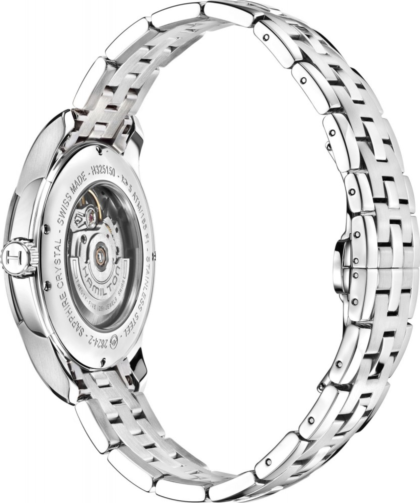 Funkce:Čas, svítící ručky a indexy, strojek swiss kalibr H-10 - vyráběn firmou Eta exklusivně pro Hamilton = 25 kamenů (krokové ústrojí ocel/kámen), rezerva chodu 80 hodin, polokmity setrvačky 21.600/h = přesnost chodu 3 - 5 vteřin denně (nižší polokmity setrvačky jsou vyladěny jemnou regulací pro maximální přesnost strojku na věnci setrvačky), úprava rotoru samonátahu dle vzoru Hamilton - rotor zaopatřen speciálními výřezy na tlumení případných nárazů, automatický + ruční nátah, strojek zdoben gravírováním pro skeleton, průhledné zadní víčko pro náhled na strojek