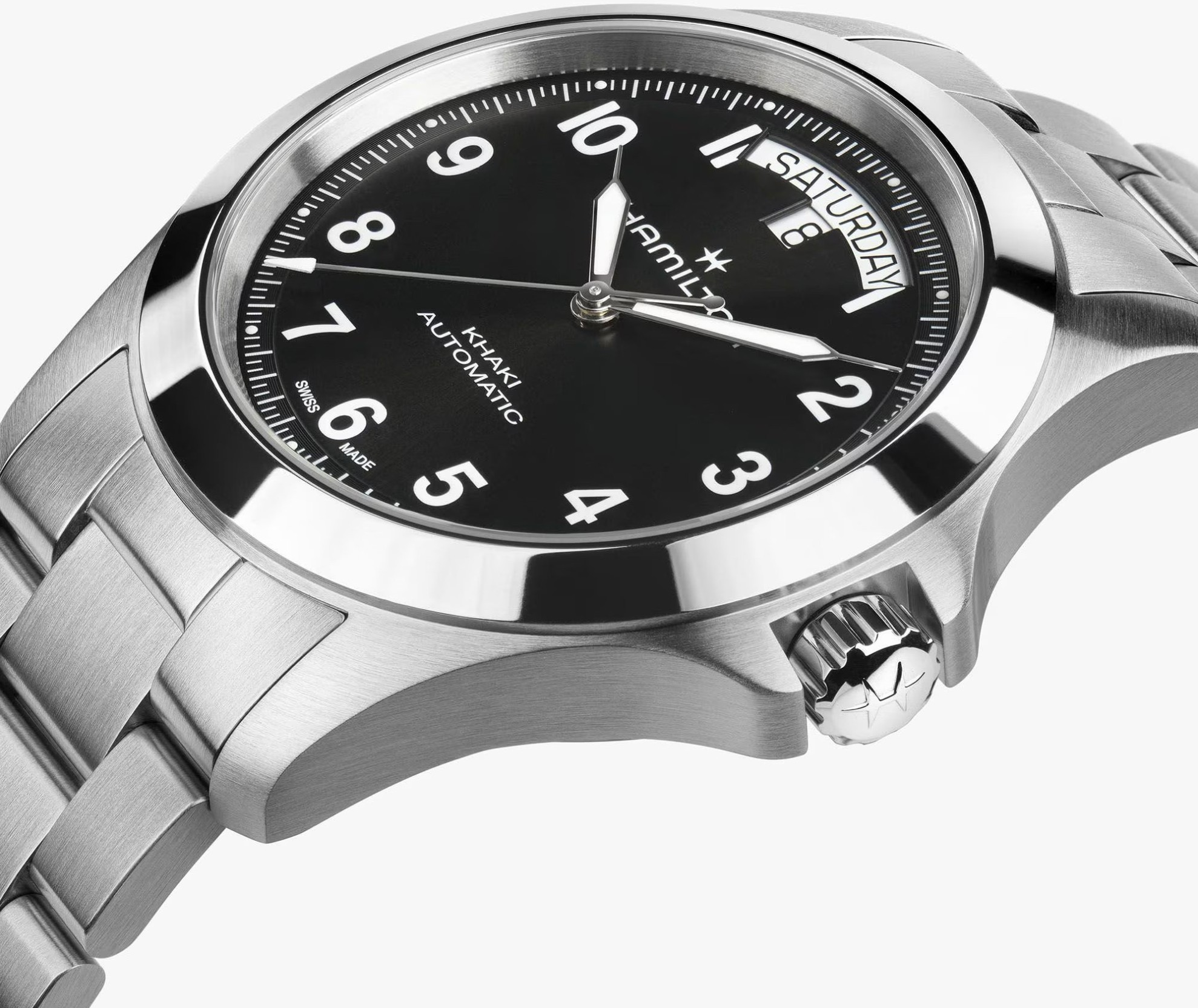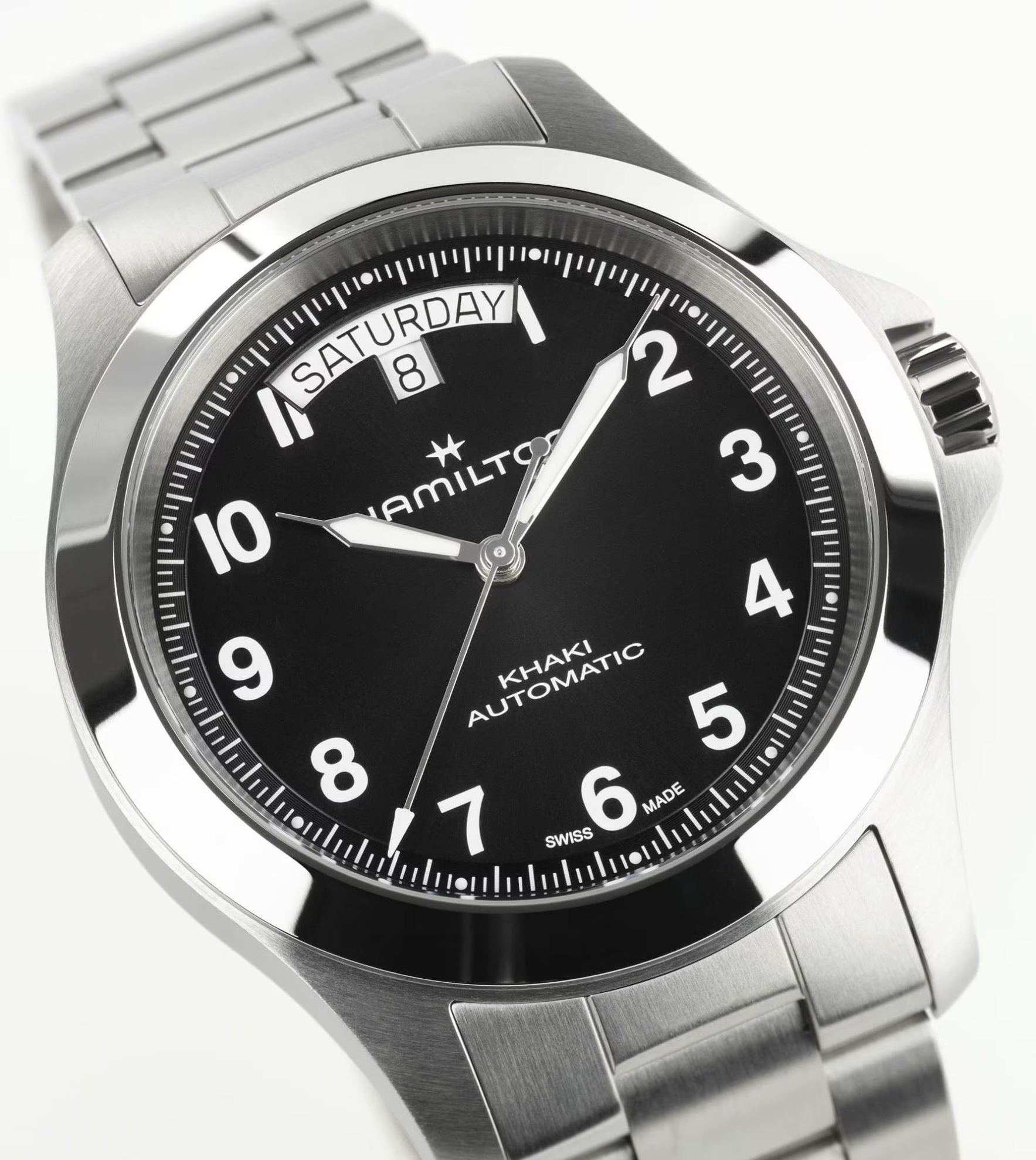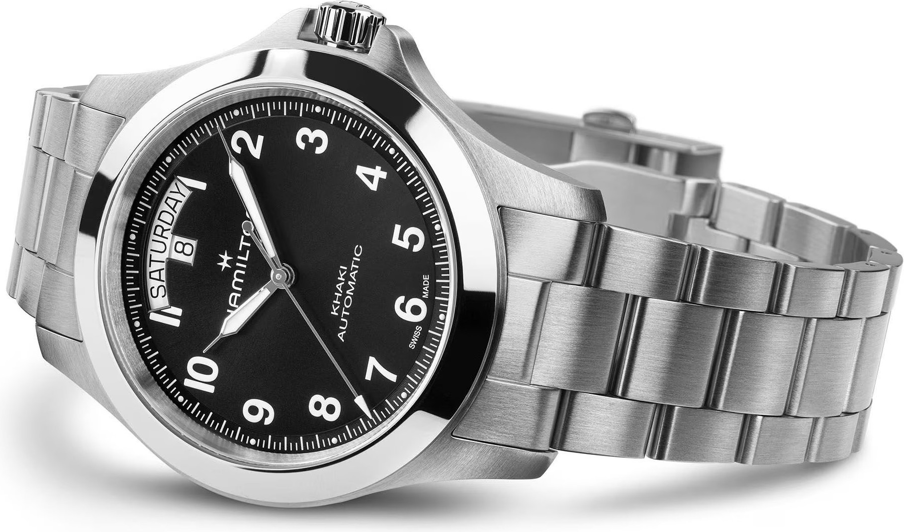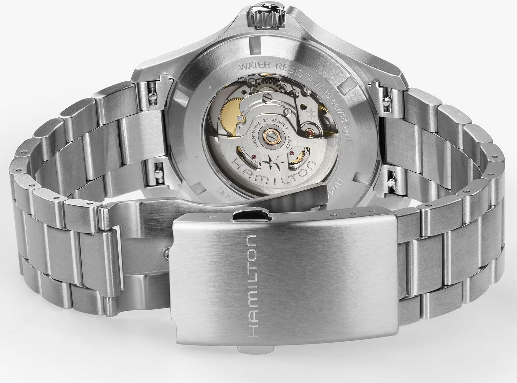 Funkce:Čas, datum, strojek Swiss kalibr H-40 (krokové ústrojí ocel/kámen) - vyráběn firmou Eta exklusivně pro Hamilton (25 kamenů), rezerva chodu 80 hodin, polokmity setrvačky 21.600/h = přesnost chodu 3 - 5 vteřin denně (vysoké přesnosti stroje je docíleno jemnou regulací šroubky na ramínkách věnce setrvačky), úprava rotoru samonátahu dle vzoru Hamilton - rotor zaopatřen speciálními výřezy pro tlumení případných nárazů na hodinky během nošení, vlásek setrvačky je vyroben ze slitiny materiálů Nivachron (velmi dobře odolává magnetickému poli a díky tomu jsou hodinky stabilně vysoce přesné), automatický nátah (hodinky se natahují pohybem ruky) + ruční nátah (hodinky lze natáhnout/dotáhnout dle potřeby i ručně korunkou), průhledné zadní víčko pro náhled na strojek, svítící ručičky a indexy (ručičky a indexy jsou potaženy luminiscenční vrstvou Super-LumiNova®, která po nasvícení dlouhou dobu svítí)