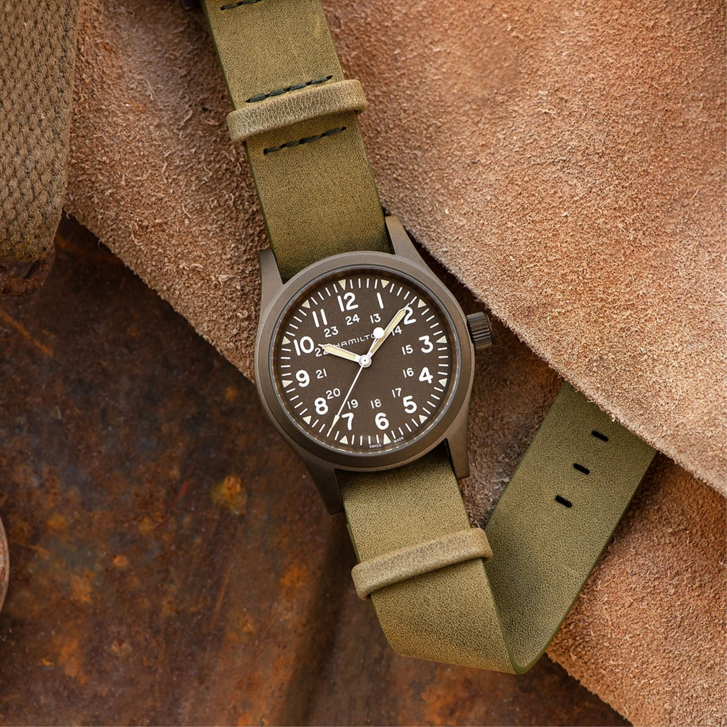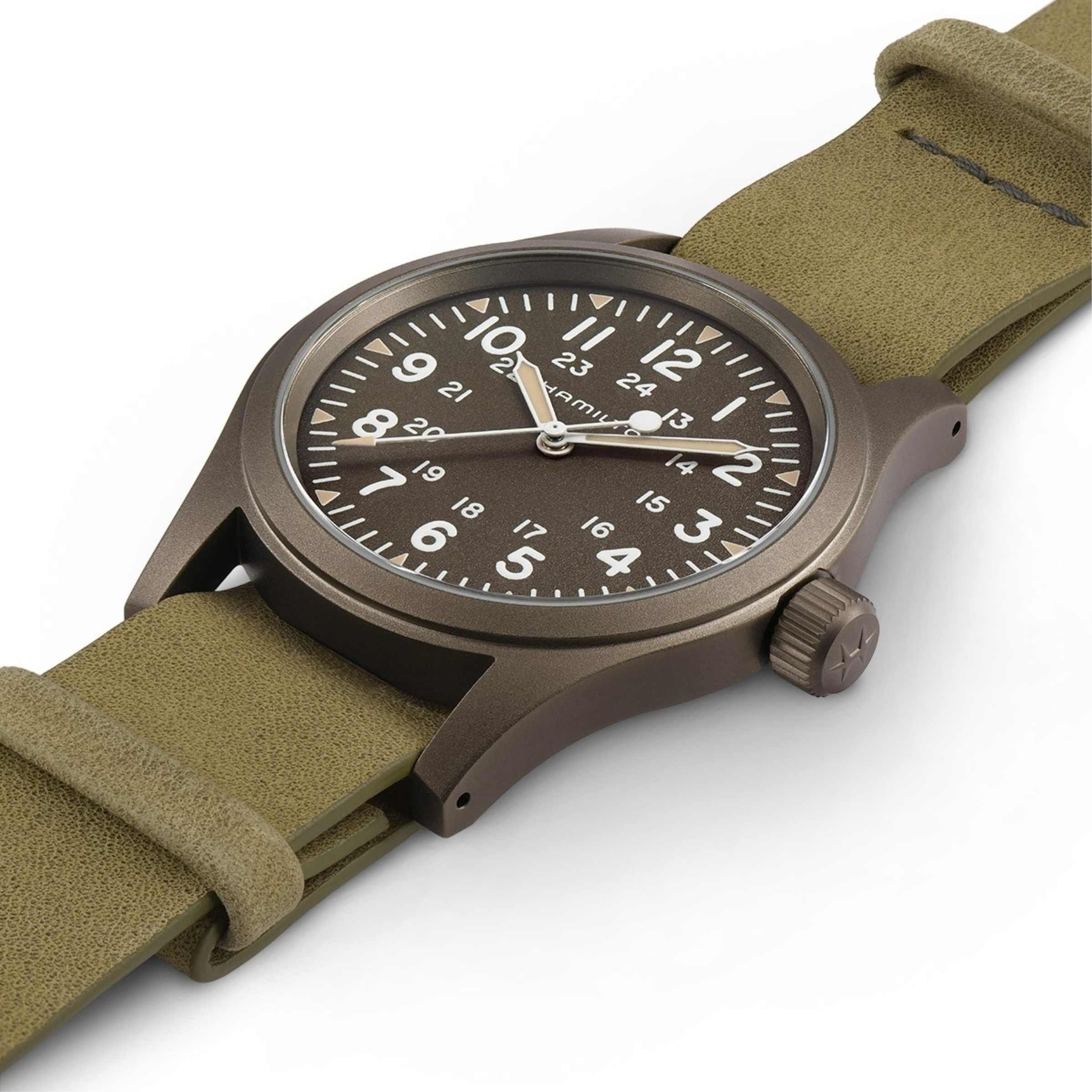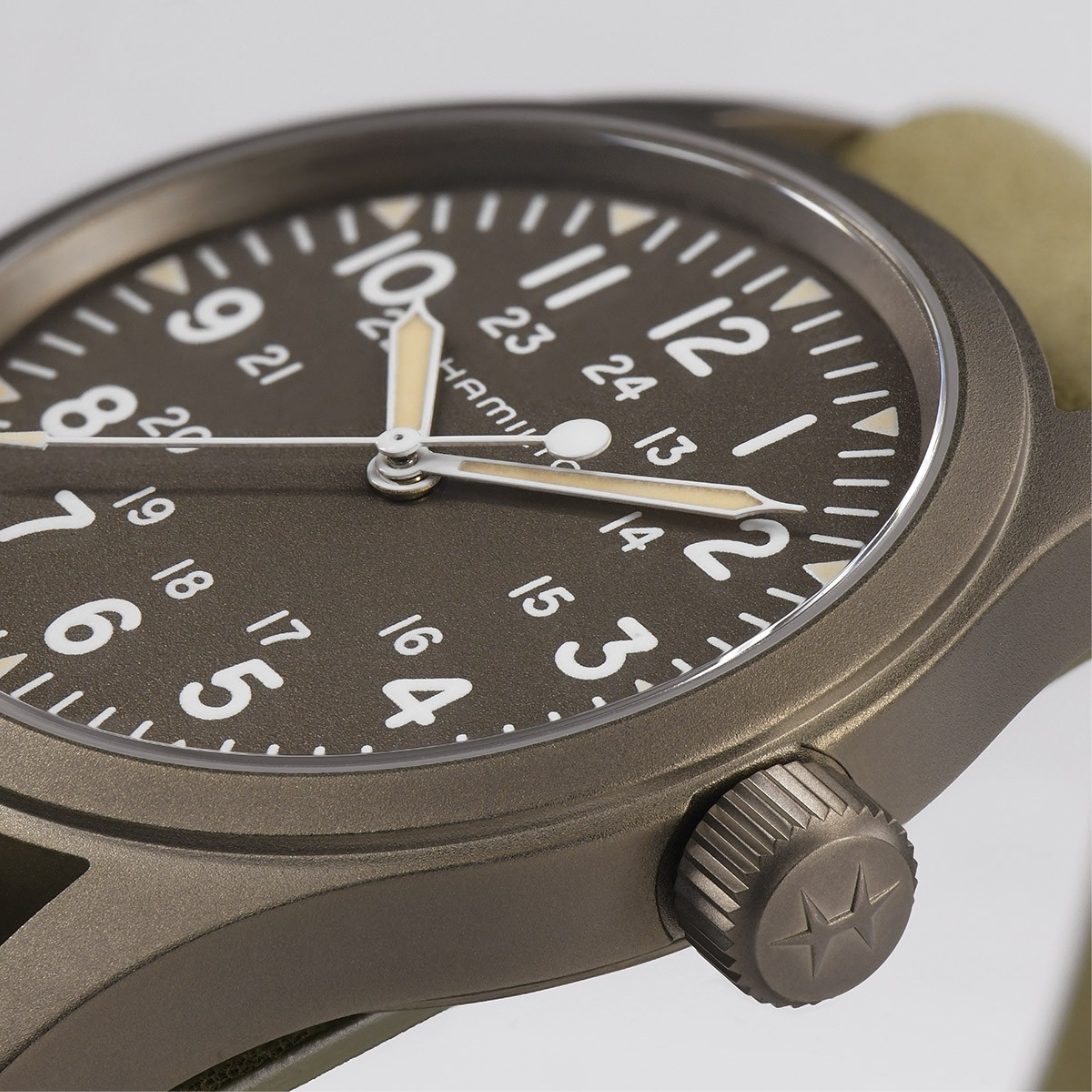 Funkce:Čas, strojek swiss kalibr H-50 (krokové ústrojí ocel/kámen) - vyráběn firmou ETA exklusivně pro Hamilton (základ ETA 2801-2 - 17 kamenů), rezerva chodu 80 hodin, polokmity setrvačky 21.600/h = přesnost chodu 3 - 5 vteřin denně - nižší kmity setrvačky jsou vyladěny regulací na maximální přesnost strojku, ruční nátah (mechanické), průhledné zadní víčko pro náhled na strojek, svítící ručky a indexy Super-LumiNova®