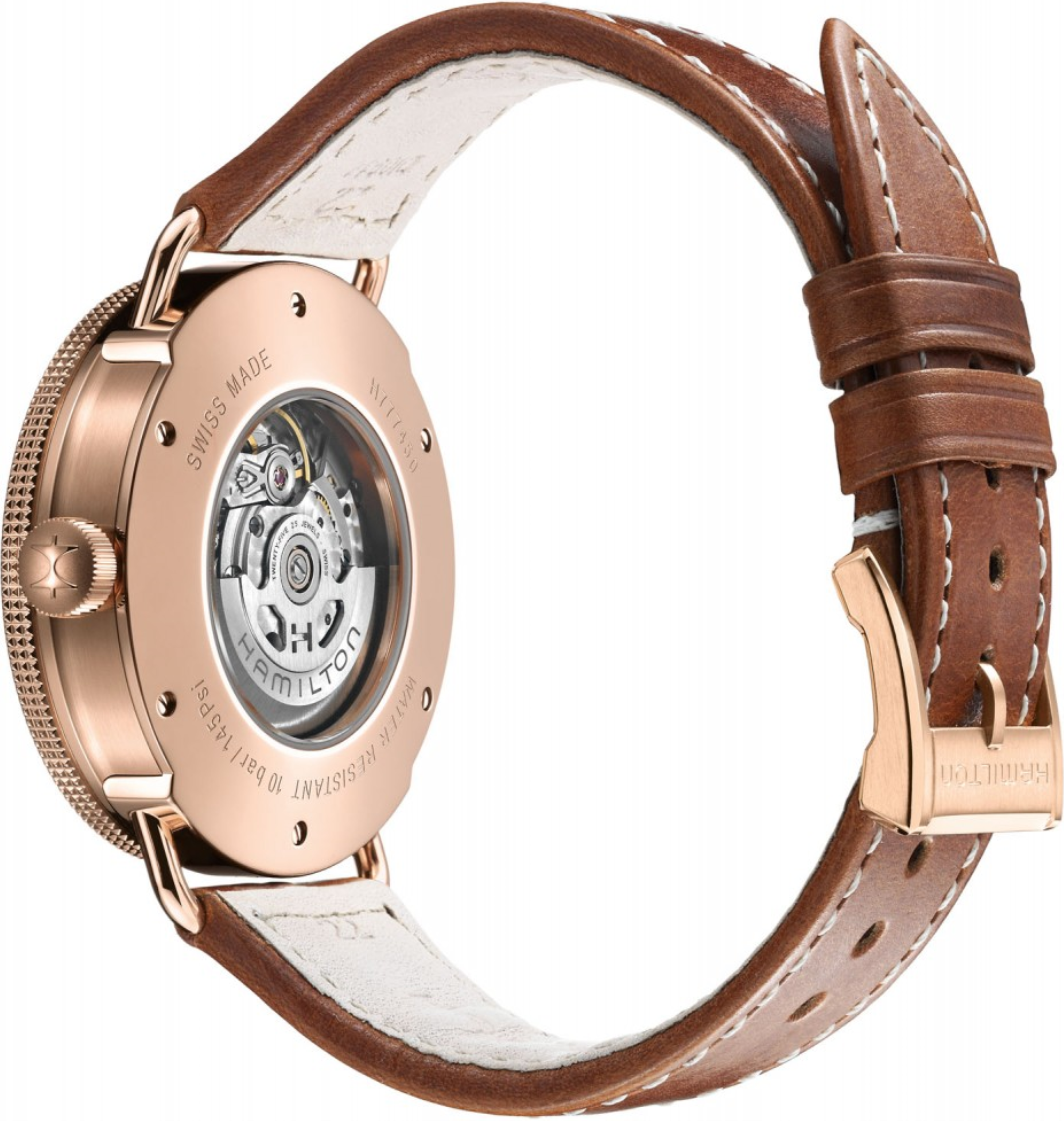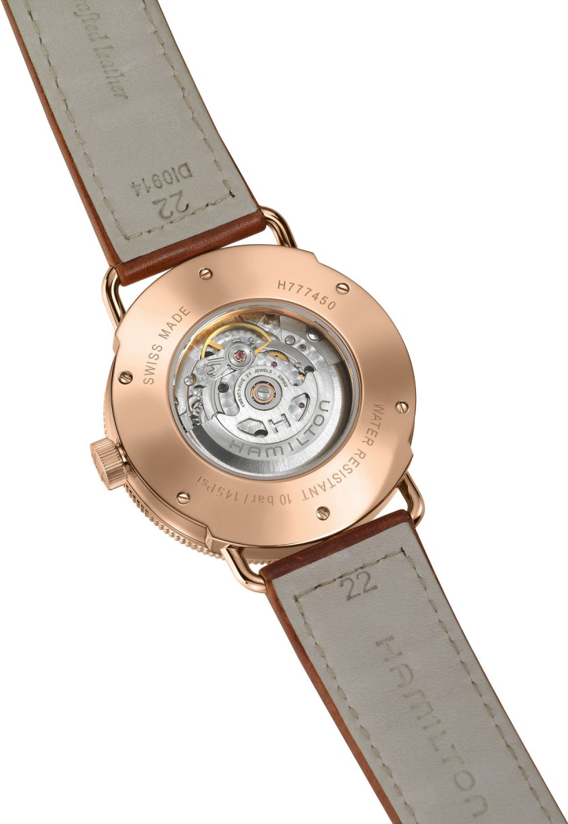 Funkce:Čas, datum, mimostředná vteřinová ručička, strojek swiss kalibr H-32 (25 kamenů) - vyráběn firmou Eta exklusivně pro Hamilton, rezerva chodu 38 hodin, polokmity setrvačky 28.800/h = přesnost chodu 2 - 4 vteřiny denně, automatický + ruční nátah, průhledné zadní víčko pro náhled na strojek